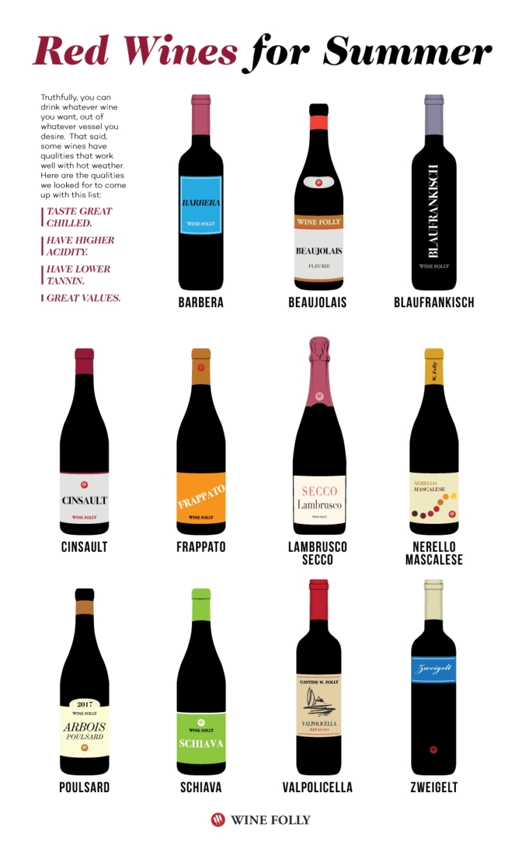 11 Vinos tintos para el verano de varietales menos habituales. Es la última infografía que ha presentado la web Winefolly para aquellos amantes del vino tinto y que quieran encontrar en verano algunos que se asocien a varietales más frescas.