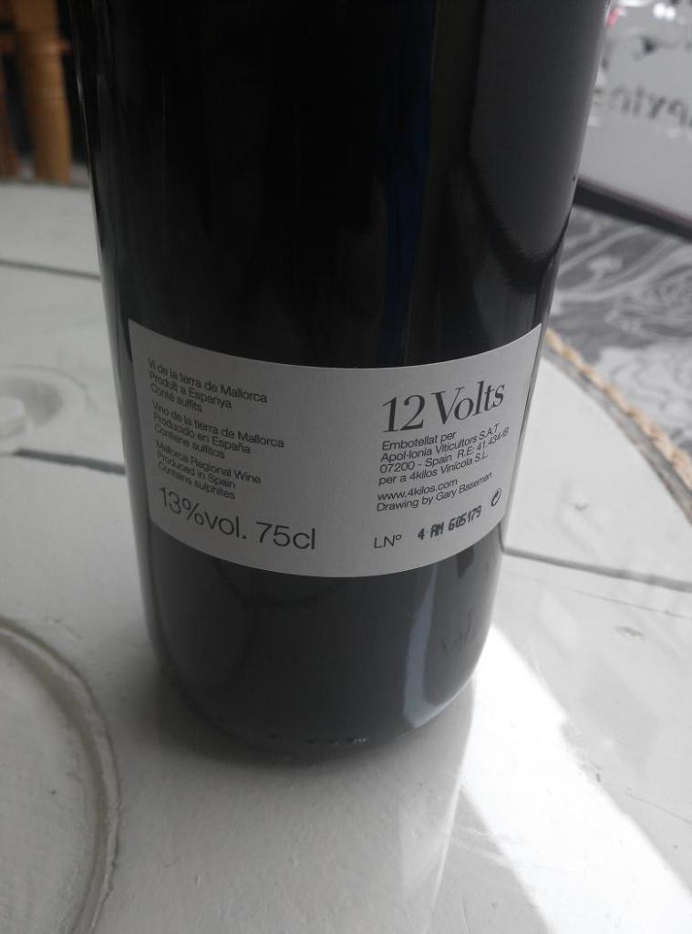 12 Volts, o 12 Voltios, perteneciente a la Denominación del Vi de la Terra de Mallorca. Es un vino tinto crianza elaborado por 4 Kilos Vinícola de la que os hablamos ayer mismo de otro de sus vinos.