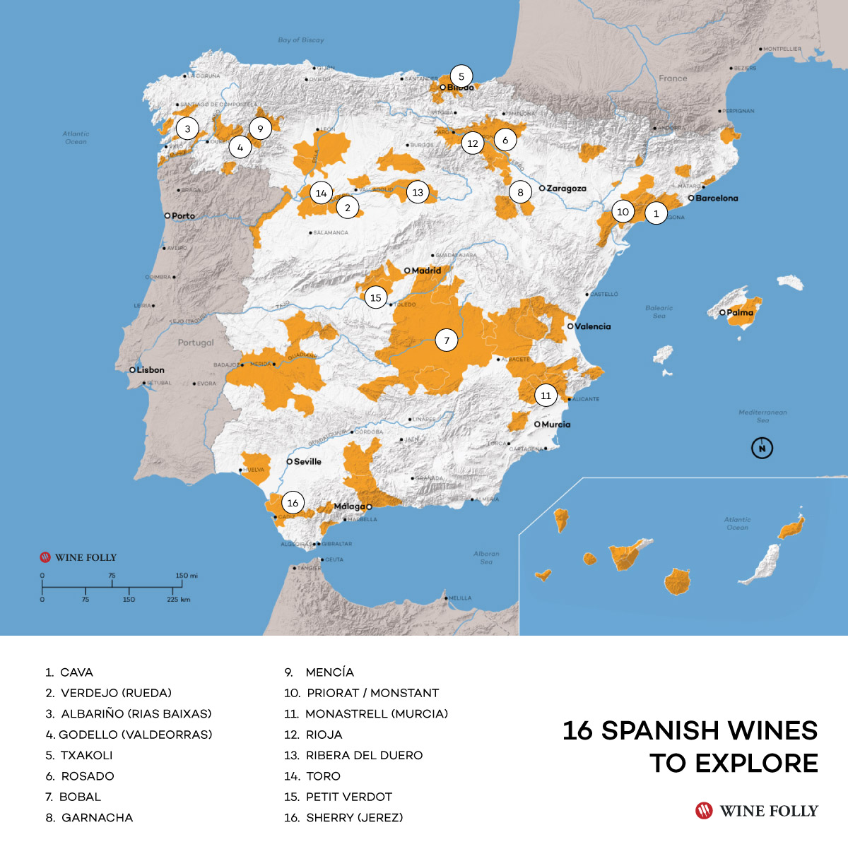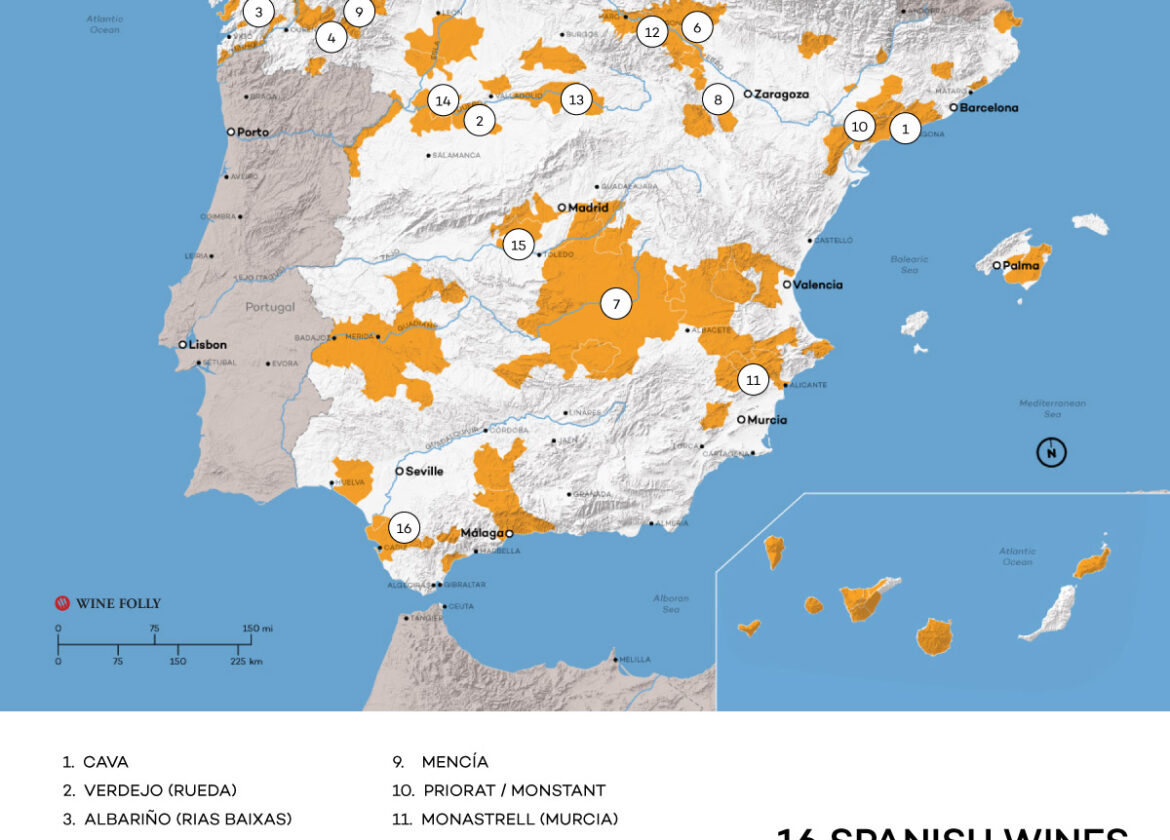 16 Vinos españoles a explorar según WineFolly. Un mapa muy actualizado en el cual encontramos 16 tipos de vinos españoles y las zonas donde más se elaboran. Todo ello dentro de las 69 Denominaciones de Origen que tiene España en materia de vinos. Pero también dentro de las 77 uvas consideradas como autóctonas de este país.