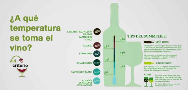 Lógicamente los blancos suelen servirse fríos mientras que los tintos tienden más hacia a que sean servidos a temperatura ambiente. Hoy os dejamos aquí esta infografía realizada por Vidcriterio que nos ha gustado mucho y que nos ayudará sin duda a conocer mejor a que temperatura debemos de servir los vinos en función de la varietal con la que fueron elaborados.