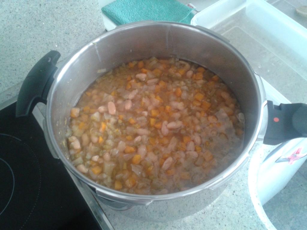 Cuando nos ponemos ya con el plato propiamente dicho, escurrimos las alubias, las enjuagamos debajo del grifo y las metemos en la olla exprés. Y, a partir de aquí, a ir echando los demás ingredientes.