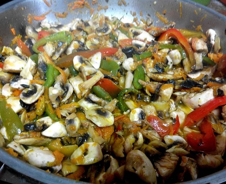 El diente de ajo que nos queda, junto a la media cebolla se ponen en una olla estilo paellero y se rehogan. Se le añaden las cebollas ralladas y los dos pimientos cortados en tiras y se rehoga todo. Cuando empiecen a ablandarse echamos los champiñones limpios cortados en trozos (van a menguar mucho en tamaño). Los mezclamos todo y salpimentamos al gusto.