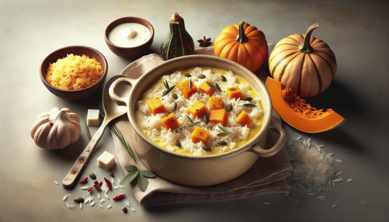Arroz cremoso de calabaza y coco preparado en cocotte