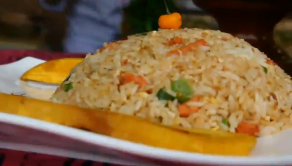 Cuando el arroz este bien caliente, incorporar el jamón y revolver, luego los guisantes, volver a remover, y luego las gambas. Sin dejar de remover, agregar la salsa de soya y el caldo. Añadir la soya extra espesa para darle un color más pronunciado, si el oficiante asi lo desea. Incorporar por último la mitad de las tiritas de tortilla. Servir en una fuente de servicio caliente, adornando por encima con el