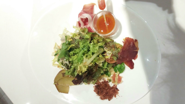 Para comenzar con el menú degustación nos encontramos con una 'Ensalada con manzana reineta, jamón ibérico en texturas y vinagreta de pimientos de El Bierzo'. El dulzor de la manzan, con el toque del jamón, quedan perfectamente combinados con esa estupenda vinagreta con pimientos de El Bierzo que os va a encantar.