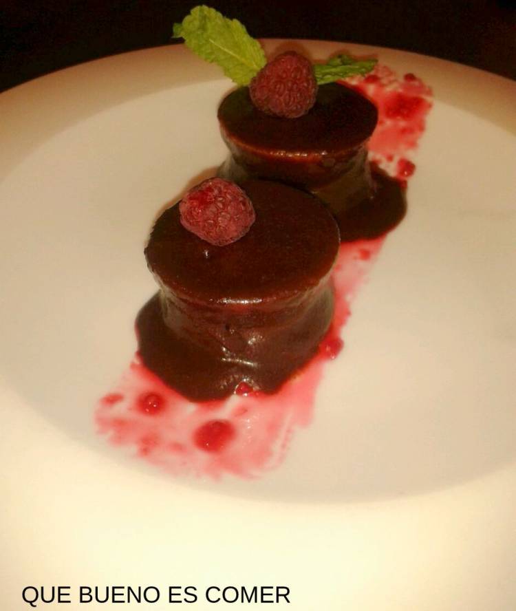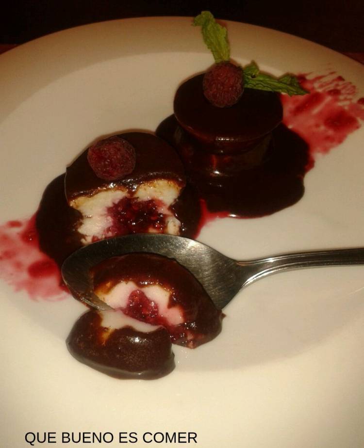 Para montar nuestro postre lo unico que tenemos que hacer es desmoldar los discos de nuestro bavaroise, poner un poco del coulis en el centro y juntarlo a otro disco de modo que el coulis quede entre ambos, con ayuda de una brocheta de madera larga sumergimos en el chocolate caliente y escurrimos el exceso, colocamos en el plato y decoramos con un brochazo de coulis en el fondo del mismo, unas frambuesas sobre el postre y algunas hojas de menta y si quereis un poco de coco rallado espolvorando por encima.