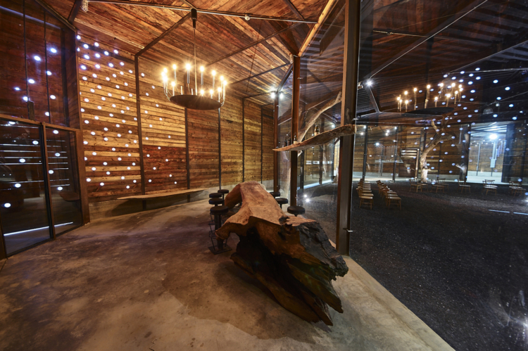 Los elementos más predominantes son maderas recicladas y tierra apisonada de la zona. Ambos materiales permiten la perfecta integración de este complejo en su entorno, claramente rústico. Pese a su tamaño, la decoración la permite confundirse con el entorno a la perfección. Además, parte de la bodega está escondida bajo tierra para aprovechar la ventaja de la tierra que protege contra los cambios de temperatura volátiles. Un gran espejo de agua cerca también sirve como un aislante térmico natural.