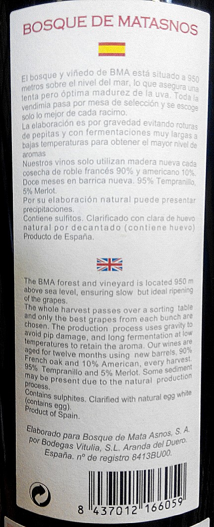 Bosque de Matasnos 2011 es un Ribera del Duero elaborado en las bodegas de mismo nombre, Bodegas Bosque de Matasnos, polivarietal con 95% Tempranillo y un 5% Merlot casi testimonial.