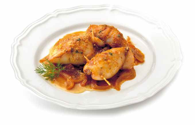 Se quita la cuerda con la cual han quedado cosidos los calamares y se sirven en una fuente un poco honda con su salsa.