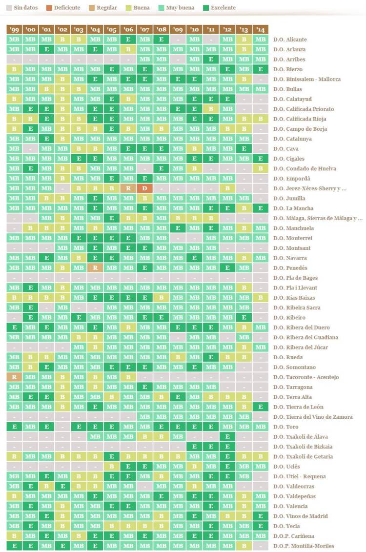 ¿Quieres saber como han sido calificadas las últimas 15 añadas de los vinos producidos en España?
