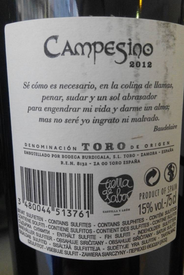 Hoy tenemos un vino tinto elaborado en la D.O. Toro, como es este Campesino 2012 Tinto, elaborado como monovarietal Tinta de Toro con prefermentación en frio (6ºC) durante 4 ó 5 días y fermentación maloláctica.