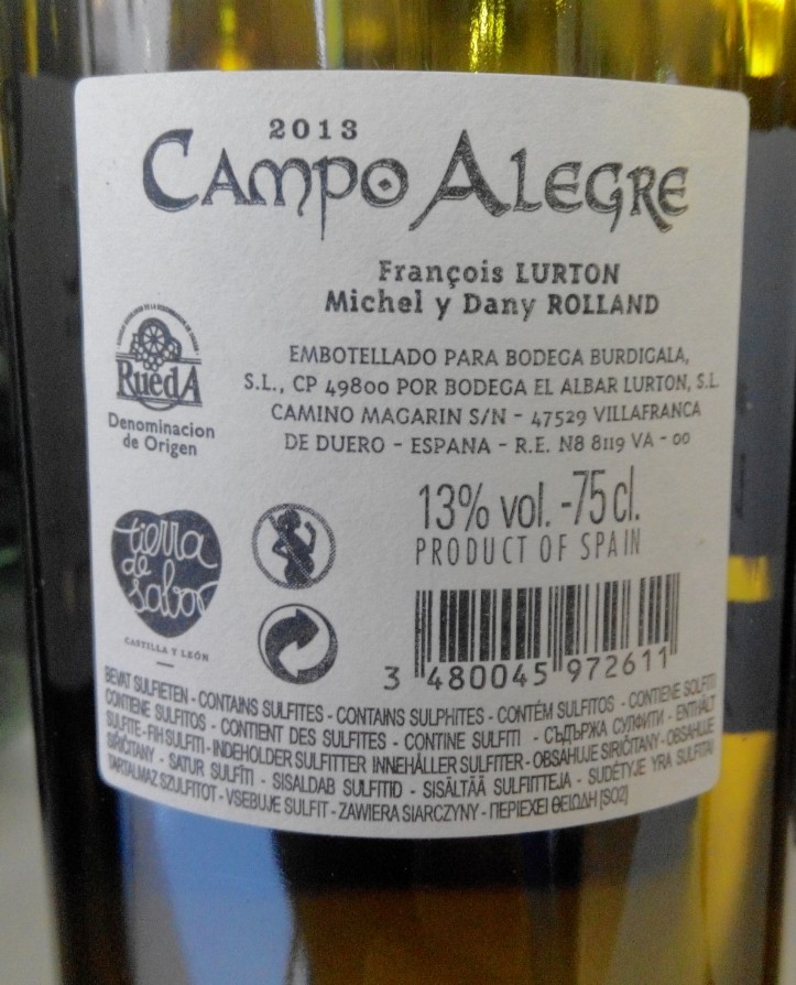 Hoy nos fijamos en este vino blanco, Campo Alegre 2013, vino blanco joven elaborado por Bodega El Albar Lurton, perteneciente al grupo François Lurton, en la D.O. Rueda.