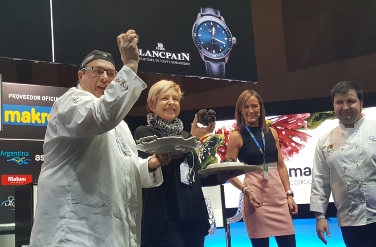 César Román sostiene la placa al Mejor Cachopo de España 2016, con la actriz Ana Villa. Dcha., el cachopo ‘clásico’ premiado. MG - CM.