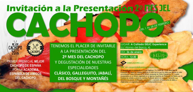 El cachopo asturiano es el plato de moda en Madrid. A Cañada DELIC Experience presenta su 2º Mes del Cachopo este jueves 26 de enero con una degustación de cinco variedades inspiradas en la cocina de la Cornisa Cantábrica: ‘clásico’, ‘galleguito’, ‘jabalí’, ‘del bosque’ y ‘montañés’. Presidido por el propietario y jefe de cocina César Román, el acto comienza a las 12:30. Los cachopos se maridan con sidra natural ‘La Penúltima’, obtenida de manzanas de pequeños productores de la Cuenca Minera. La Academia Española de Amigos del Cachopo ha elegido su ‘clásico’ como Mejor Cachopo de España 2016.