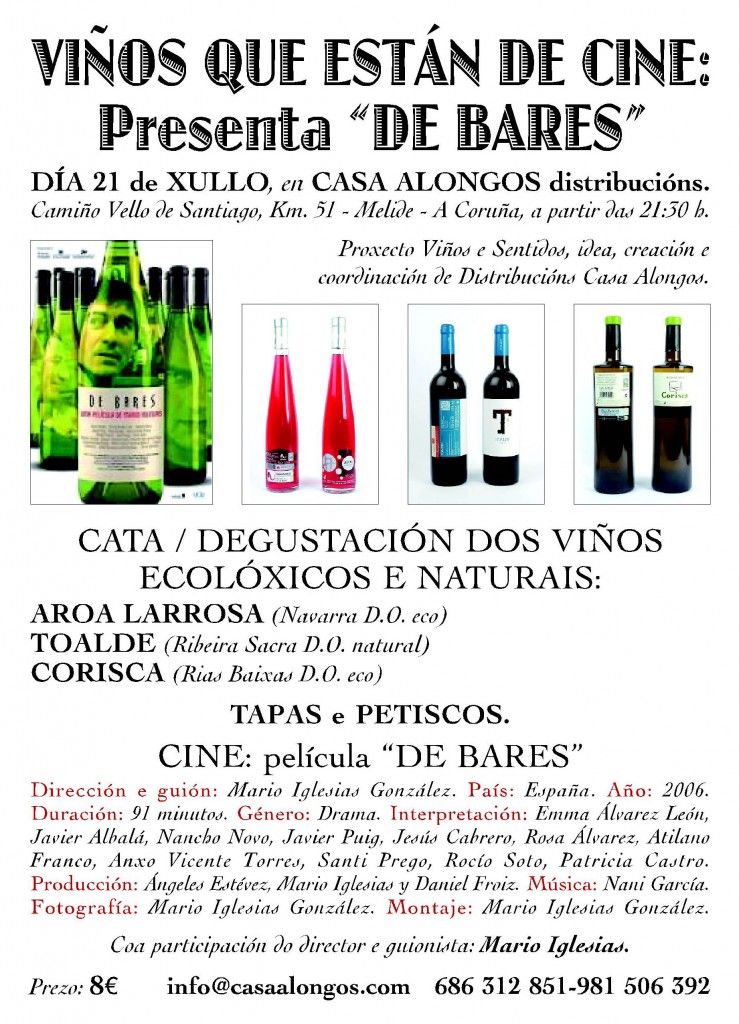 - Viños que están de cine : 2ª parte : DE BARES, con la película e intervenció nde su director Mario Iglesias y los vinos : Toalde ( Ribeira Sacra D.O.), Corisca ( Rias Baixas D.O. y Aroa Larrosa ( Navarra D.O) gastronomía artesanal de Triskel de Melide