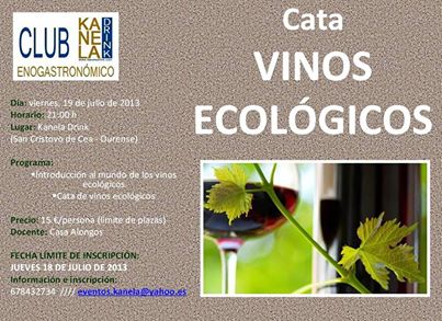 Ya os avisamos con tiempo para que los amantes del vino y de los productos ecológicos os podáis agendar este evento. Y es que el próximo día 19 viernes, se va a celebrar una cata de vinos ecológicos en Kanela Drink, ubicado en San Cristovo de Cea, Ourense, en la cual se dará una introducción al mundo de los vinos ecológicos y posteriormente se podrá realizar la cata de alguno de ellos.