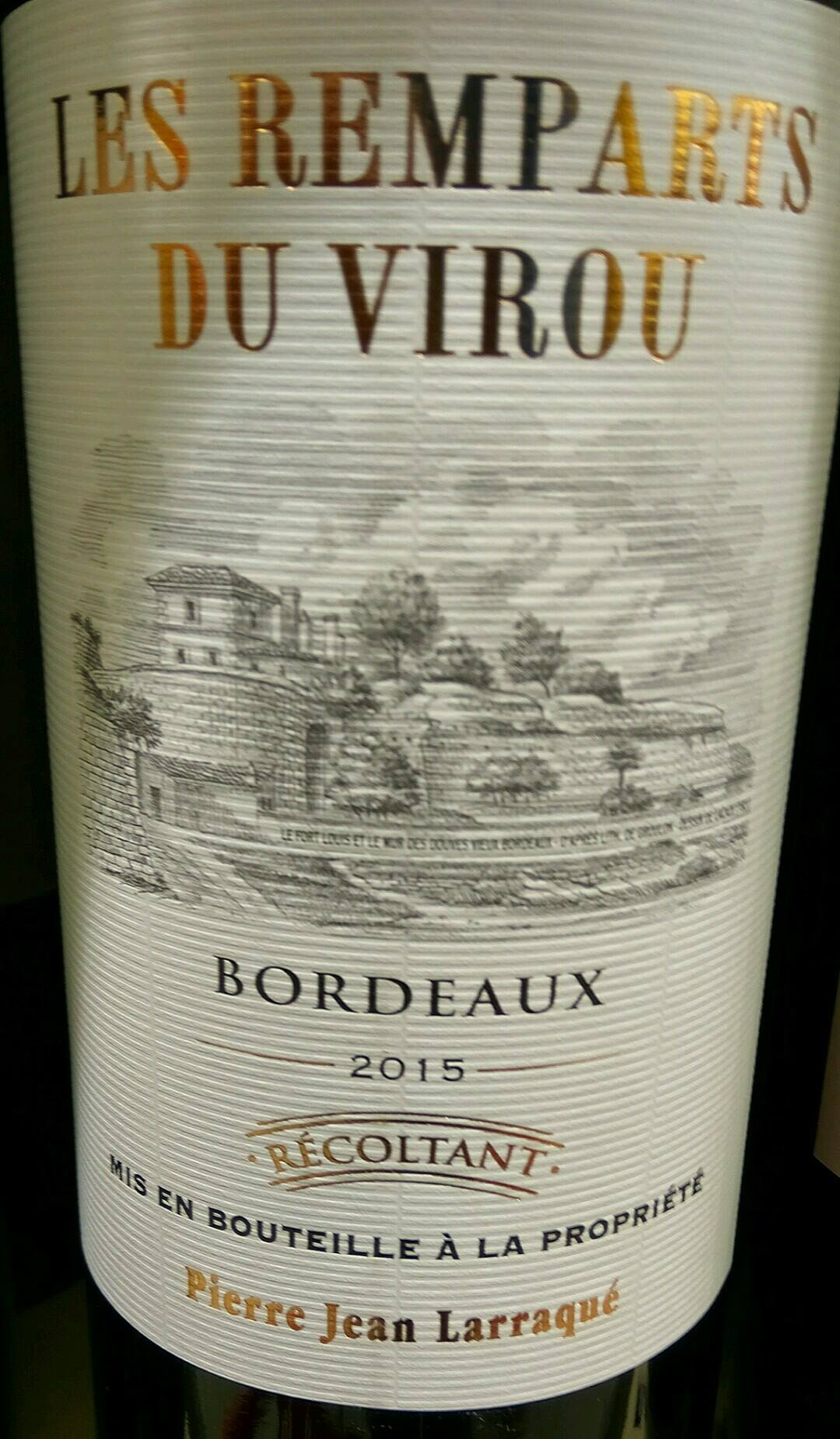 Catamos Pierre Jean Larraque Les Remparts Du Virou 2015. Un ejemplo de que no todo el vino de Francia es excelente. Un vino elaborado por Château Le Virou, acogido a Bordeaux Controleé. El truco está en poner que es un vino de Bordeaux ya que así se vende mejor.
