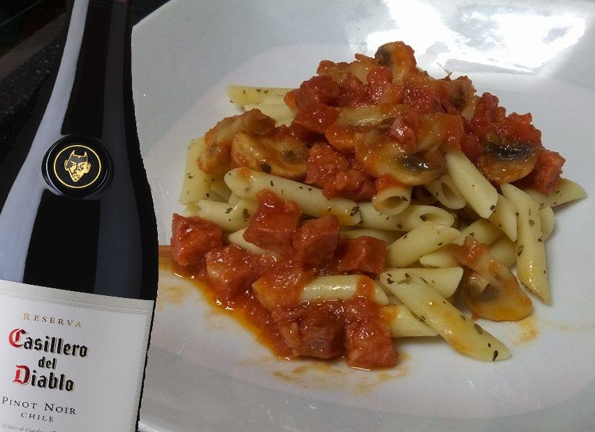 Macarrones con jamón y champiñones maridado con un Reserva Pinot Noir