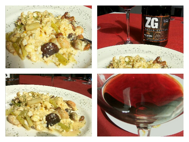 Revuelto de ajetes, trigueros, gambas y setas maridado con tinto roble Ribera del Duero