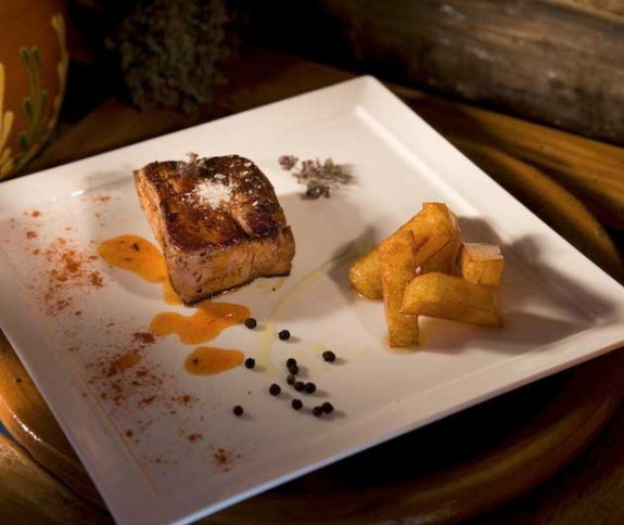 Pasemos a los ingredientes para esta plato para 4 personas: Lomo de Chato Murciano 0,75 kgr., aceite de oliva virgen extra Flor de Cuquillo 0,5 litros, pimentón dulce 0,014 kgr., pimentón picante 0,007 kgr., orégano hojas 0,003 kgr., 3 dientes de ajo, sal fina y sal maldón, pimienta negra y 0,5 kgr de patatas nuevas.