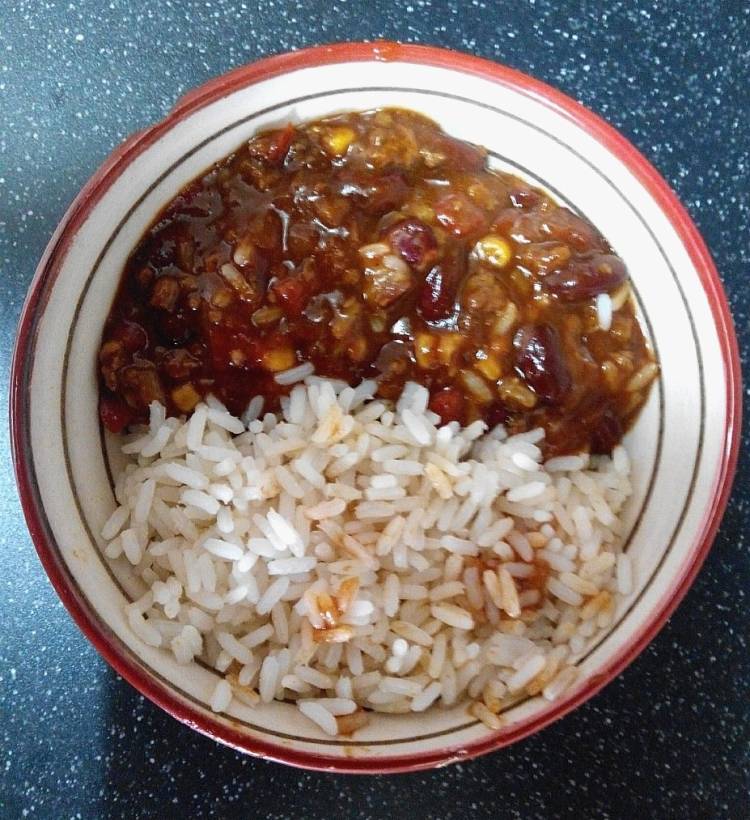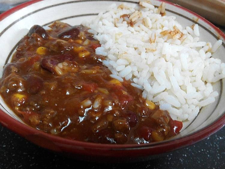 Chili con carne y arroz blanco