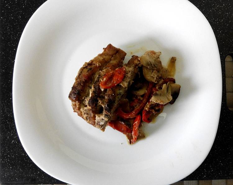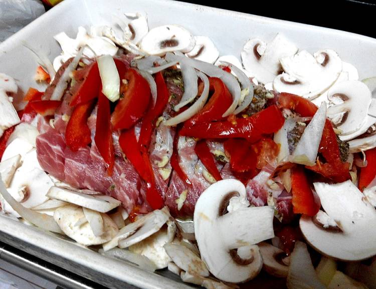 Una vez adobado cortamos el tomate en rodajas y el pimiento y la cebolla en tiras y las metemos entre cada filete de forma alterna. La idea es que suelten su sabor en la cocción y a la mita de la misma las retiraremos.