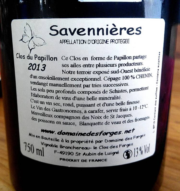 Savennières es una zona de vinos de Francia perteneciente a la zona del valle del Loira. Hablamos de este Clos du Papillon 2013, un vino blanco monovarietal 100% Chenin Blanc procedentes de viñedos viejos previamente seleccionados.