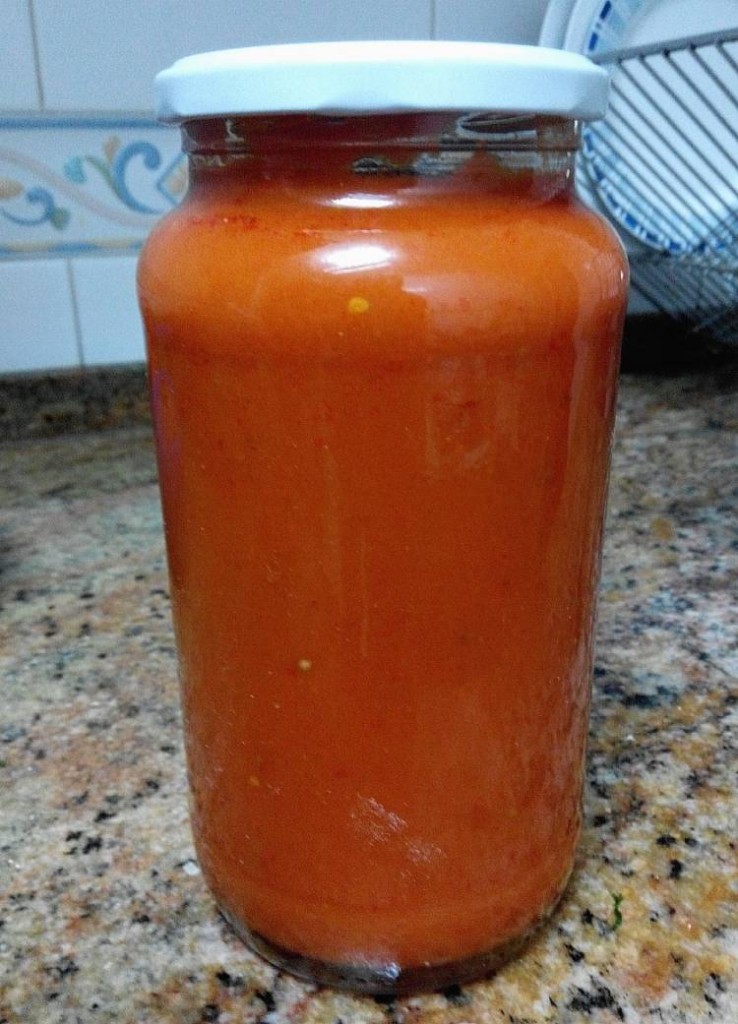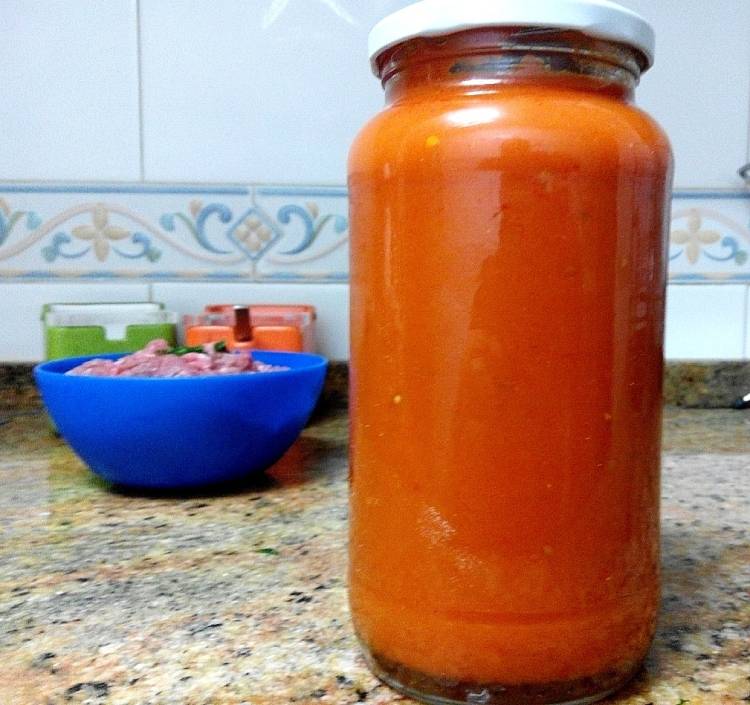 Podéis consumirlo directamente o, como hacemos nosotros, lo envasamos para todo el año. En ese caso compramos tarros y tapas completamente nuevas y los llenamos hasta que quede medio dedo de la tapa y se le echa un chorrito de aceite de oliva. Se cierran y nosotros los metemos en una olla con agua tibia y esperamos a que hierva. Los sacamos y ya los guardamos para cualquier receta como por ejemplo la que véis en la foto que la vamos a emplear en una salsa boloñesa.