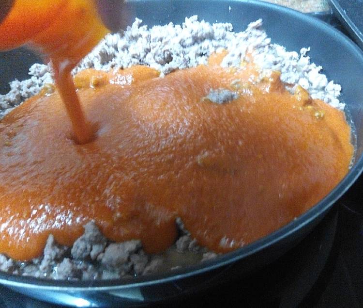Es el momento de echar el tomate. Todo lo llevamos a ebullición para posteriormente bajar el fuego al medio y dejar el conjunto cociendo una hora. Pasado este tiempo retiramos del fuego y comprobamos como está de sal y rectificamos si hace falta. Es bueno que en ese momento lo probemos porque nos indicará el grado de acidez que puede haber dejado el tomate e igual hay que echarle azúcar.