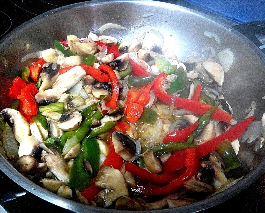 Nosotros hemos escogido entre las verduras el pimiento rojo, el pimiento verde, champiñones y cebolla, pero tienen cabida casi todas las verduras.