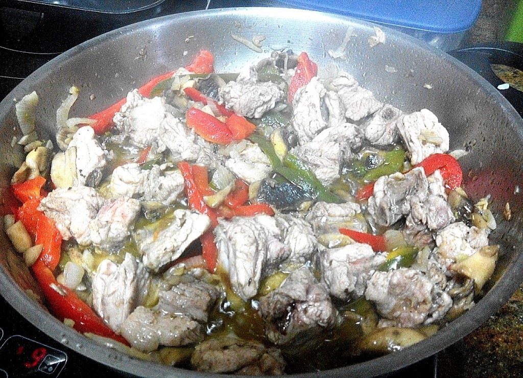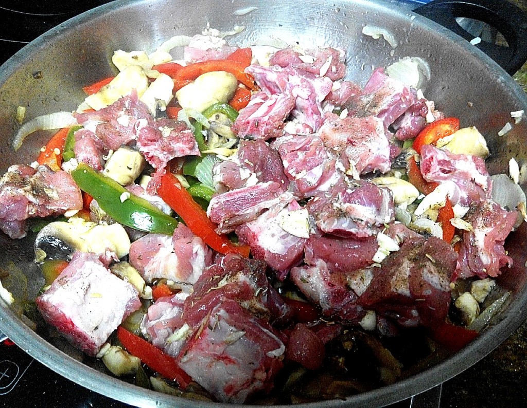Cuando estén rehogadas, empezamos a añadir la costilla: