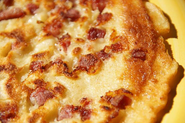 Nosotros, en esta ocasión, lo que hacemos es dorar una cara y al darle la vuelta para dorar la segunda, echamos el jamón serrano cortadito, con lo cual lo dejamos incrustado en la masa de nuestra crepe (al estilo quiché).