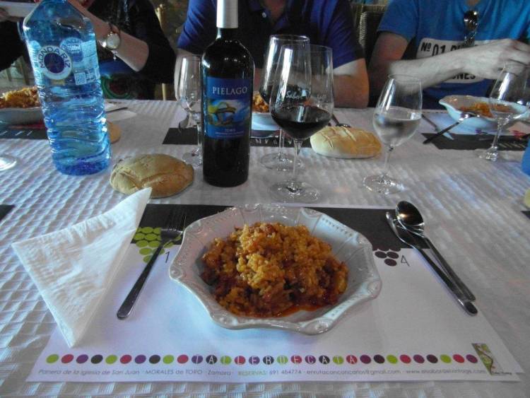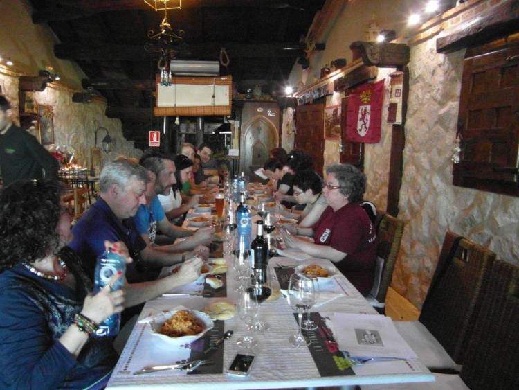 Después del merecido descanso, y haber admirado el edificio construido en 1761 con piedra, madera y tapial de adobe y la gran cantidad de vinos D.O. Toro con que cuentan en su bodega, socios y simpatizantes nos dirigimos al comedor ubicado en la primera planta, del edificio, bajo un impresionante techo con vigas de madera, donde degustamos un estupendo menú zamorano, compuesto por un exquisito y abundante "Arroz a la zamorana", un plato "de resistencia" a elegir entre Chuleta de Ternera de Aliste o Mero rustido en zarzuela de mariscos y Tarta casera de chocolate. Todo ello regado con el Tinto D.O. Toro "Piélago" de la Bodega Cañada del Pino, Agua, Café y Chupito de Mistela.