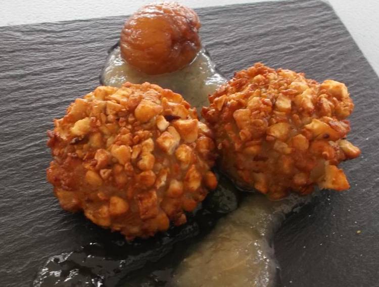 Hoy, aunque os suene croqueta y la asociéis a un entrante o a un plato salado, vamos a plantearos más bien un postre. Se trata de esta receta de croquetas de castaña sobre mermelada de pera.