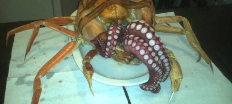 El quería que sus invitados disfrutasen del sabor de los típicos platos de estas cenas navideñas, y no se le ocurrió mejor forma que unirlos todos en el mismo plato, creando un nuevo animal de na especie francamente extraña: cuerpo de pavo, por cabeza los tentáculos de un pulpo y de patas las de un centollo o nécora grande. Fijémonos: