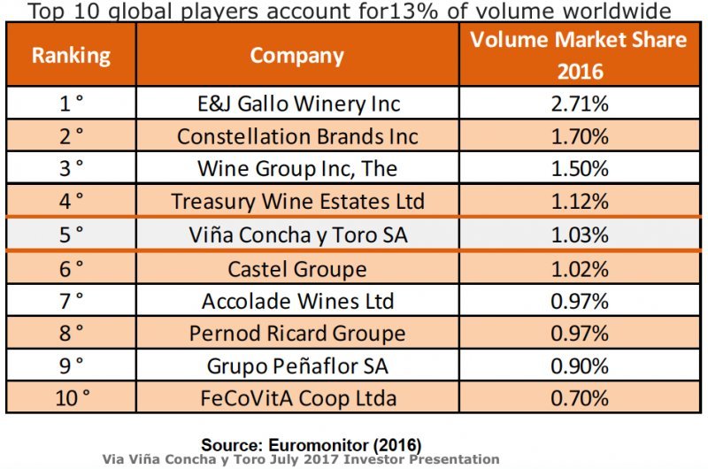 Se trata de una información facilitada por Euromonitor 2016 y que tiene en su presentación la bodega chilena Viña Concha y Toro SA.