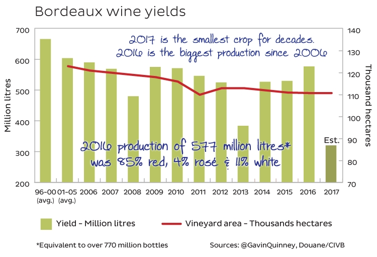 Drástica caída en la cosecha en Burdeos este año. La American Association of Wine Economists AAWE ha realizado el siguiente gráfico que resulta la mar de ilustrativo para ver la caída de la producción de vino que ha experimentado este año la zona de Burdeos. Y no es sino más que una muestra de lo que está ocurriendo en prácticamente en toda la vieja europa.