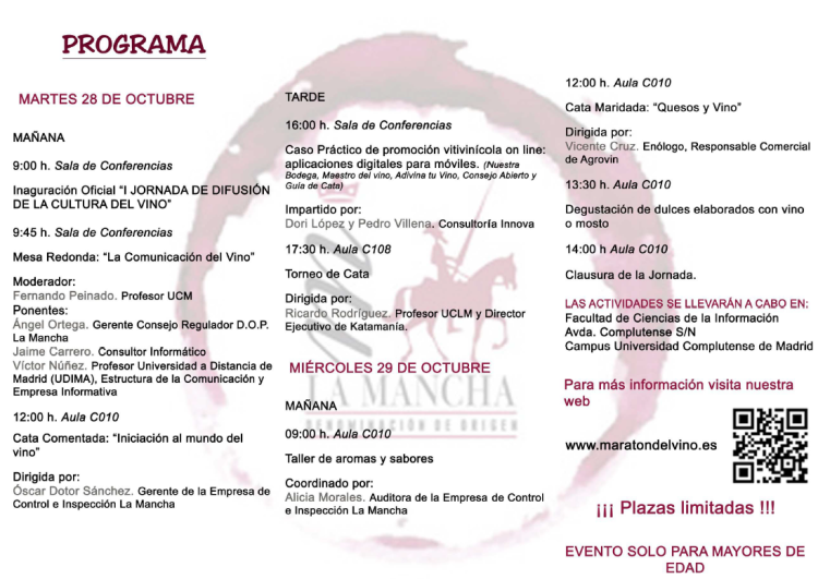La facultad de Ciencias de la Información, de la UCM centrará el inicio de las I Jornadas de difusión de la cultura del vino entre los jóvenes universitarios. No se ha elegido, precisamente, a la facultad de futuros profesionales de la comunicación, al azar. Desde la Denominación de Origen La Mancha son conscientes de la importancia de la efectividad comunicativa en la promoción del vino. Por este motivo, diversas mesas redondas y catas comentadas tratarán de romper tópicos más frecuentes en torno a la cultura del vino presentando a los universitarios también las múltiples posibilidades de salida laboral en la comunicación y el marketing del vino.