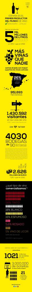 Que hemos acabado el año pasado 2013 como el país productor de vino del mundo con mayor cantidad elaborada, es algo que ya no es noticia. Pero si hay otros muchos datos que giran entorno al mundo del vino que desconocemos y que son muy interesantes. Por eso agradecemos a los amigos de tambiensomosasi.es (dentro de su iniciativa denominada AME: Amigos Marca España) que hayan realizado esta recogida de información tan interesante para poder realizar esta infografía global que nos indique las cifras del mundo del vino en muchos aspectos de los cuáles no teníamos constancia.