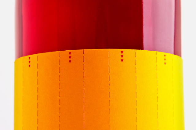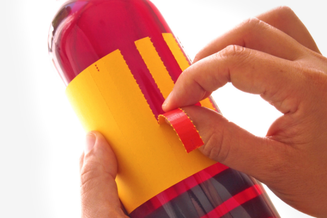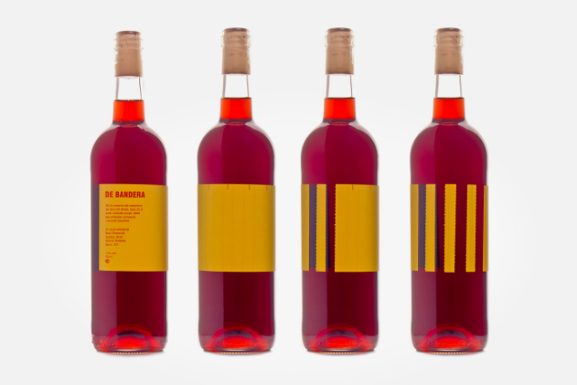 Como podéis ver en las fotos, a partir de una botella de vino rosado tienes la posibilidad de escoger con la etiqueta, que represente un vino con la bandera de España o la de Cataluña ya que con esta se pueden formar cualquiera de las dos banderas solo basta ir quitando algunas tiras.