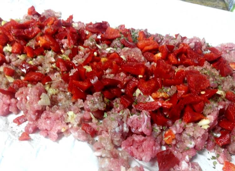 Picamos el pimiento rojo y el ajo y lo añadimos a nuestra carne que habremos salpimentado y puesto un poco de orégano.