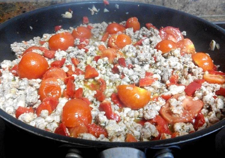 Ponemos una sartén con un poco de aceite y cuando esté caliente echaremos la carne con todo lo que le hemos añadido. Lo sofreimos todo hasta que la carne vaya cogiendo color. Nosotros añadimos en ese momento unos tomates cherry abiertos a la mitad.