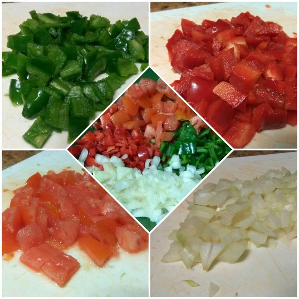 Cortamos los pimientos en cuadraditos, al igual que el tomate y la manzana (opcional, ponerla al final en rodajas). Pondremos todo en un bol. Reservamos.