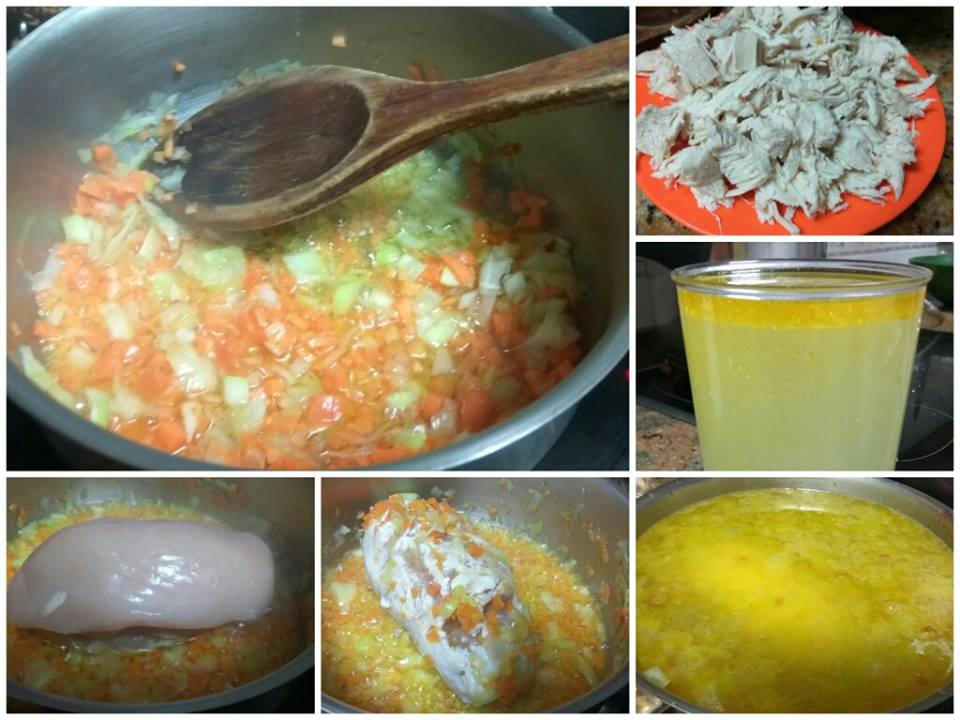 Lo primero es poner a cocer la pechuga de pollo en una olla. En el fondo ponemos dos cucharadas soperas de aceite de oliva en las que sofreímos brevemente la parte verde del puerro, la cebolla y la zanahoria cortadas en daditos pequeños. Ponemos la pechuga de pollo cubriendo de agua, salamos y lo ponemos a cocer hasta que podamos desmigar el pollo. Colamos el caldo y reservamos. Desmenuzamos el pollo y lo reservamos también.