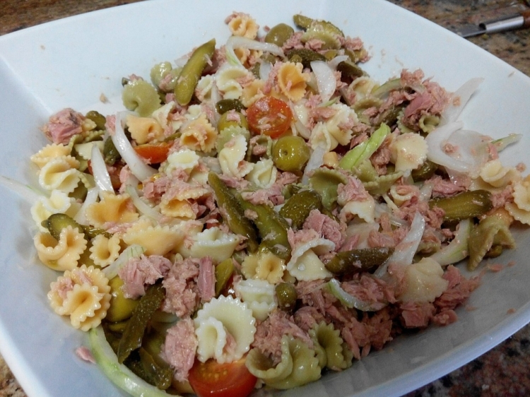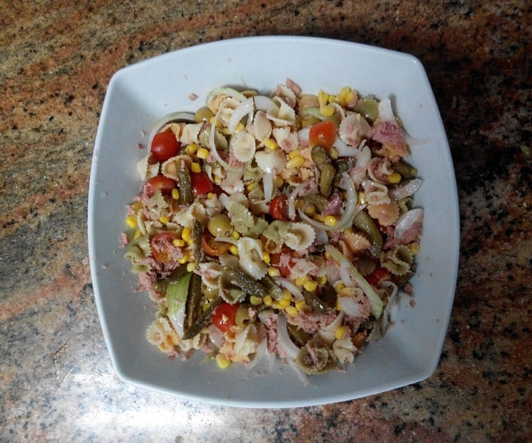 Lo primero es poner a cocer la pasta según las instrucciones del fabricante. Una vez hecha se escurrir y se deja enfriar en un bol, por ejemplo en el que vamos a hacer la ensalada completa.