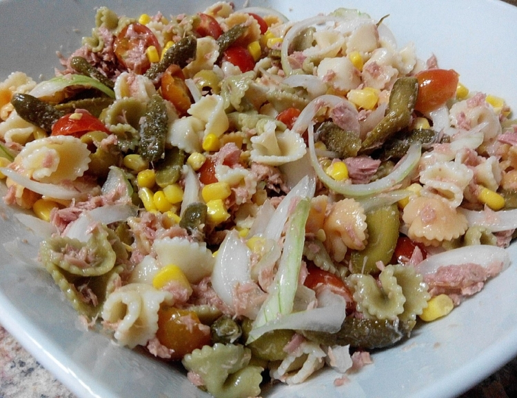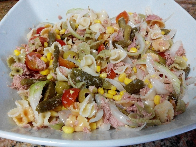 Si ayer os dejábamos una ensalada con base de arroz, hoy os la traemos con base de pasta, en concreto de margaritas de las tricolores que podéis encontrar en cualquier supermercado. Empleamos muchos de los ingredientes de ayer e incorporamos alguno nuevo, pero para que no sea tan repetitiva cortaremos los ingredientes de diferente forma, con lo cual le dará un toque diferente a la que tomamos ayer.