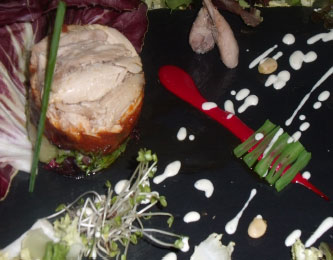 Ensalada de perdiz roja en escabeche con pisto y emulsión de pimientos