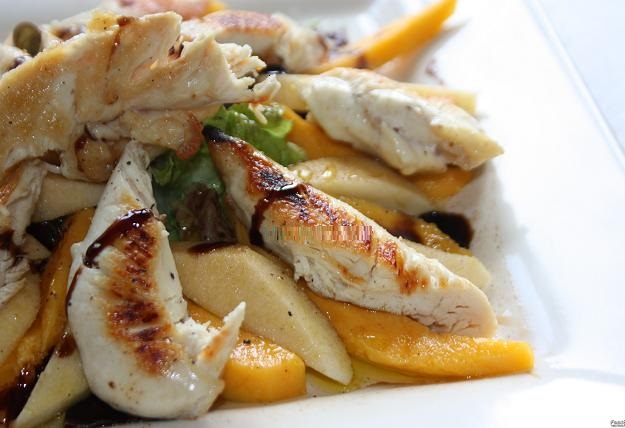 Cogemos las pechugas y las cortamos en tiras que iremos poniendo poco a poco encima del las frutas y la lechuga.