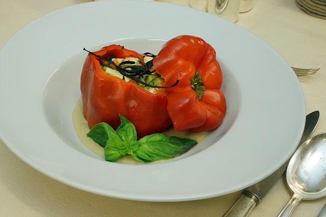 Cortamos toda la verdura en taquitos, lo mismo que los dos quesos. Lo dejamos en un plato y añadimos las colas de gambas. Salamos, echamos vinagre y aceite y con la ayuda de una cuchara vamos añadiendo el contenido al pimiento hasta que llegue arriba.