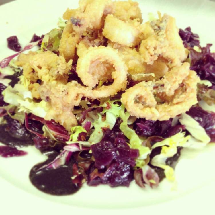 Ensalada de tallarines de calamar crujiente con bouquet de lechugas, cebolla caramelizada y aliño de su tinta, mezcla de sabores más que interesante que nos dejan los amigos del Restaurante La Parrilla Del Sirenas.